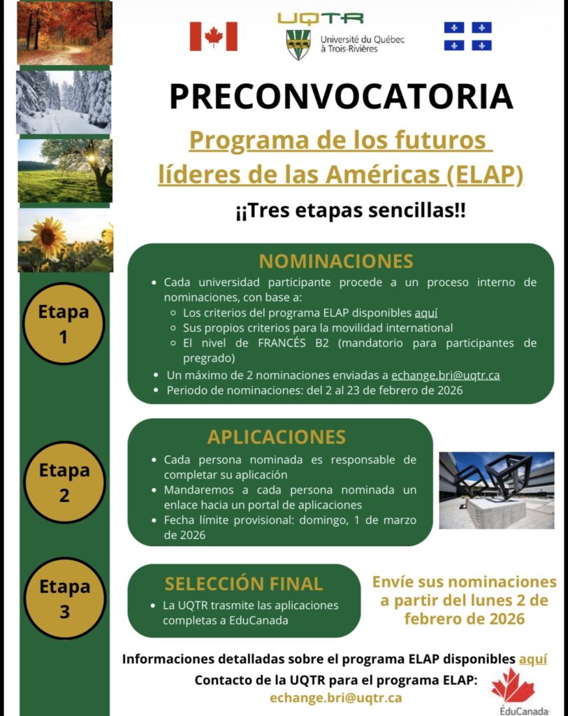 Convocatoria interna para el Programa de Líderes Emergentes de las Américas (ELAP) del gobierno de Canadá a través de la Universidad de Quebec en Trois-Rivières (UQTR).